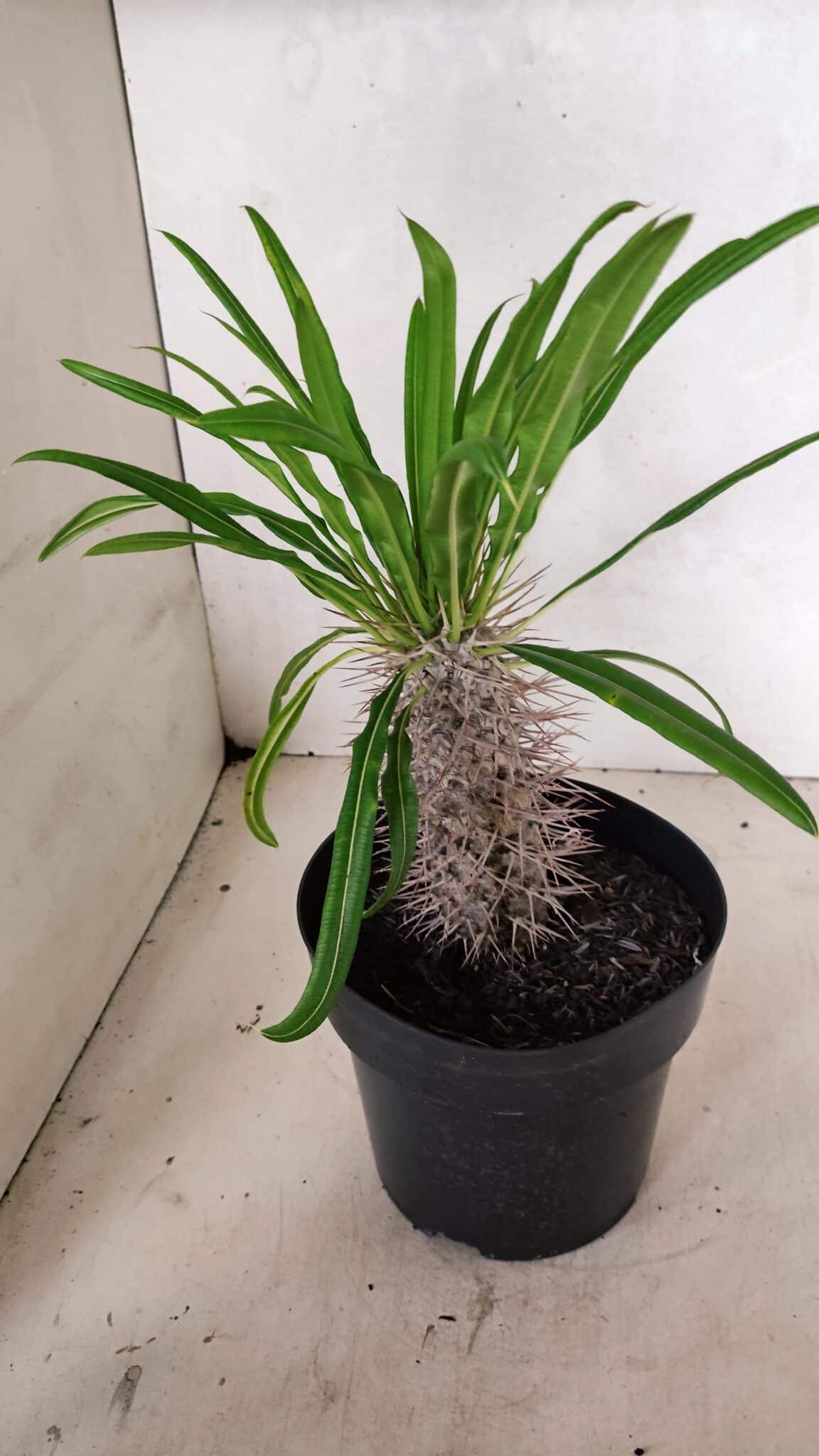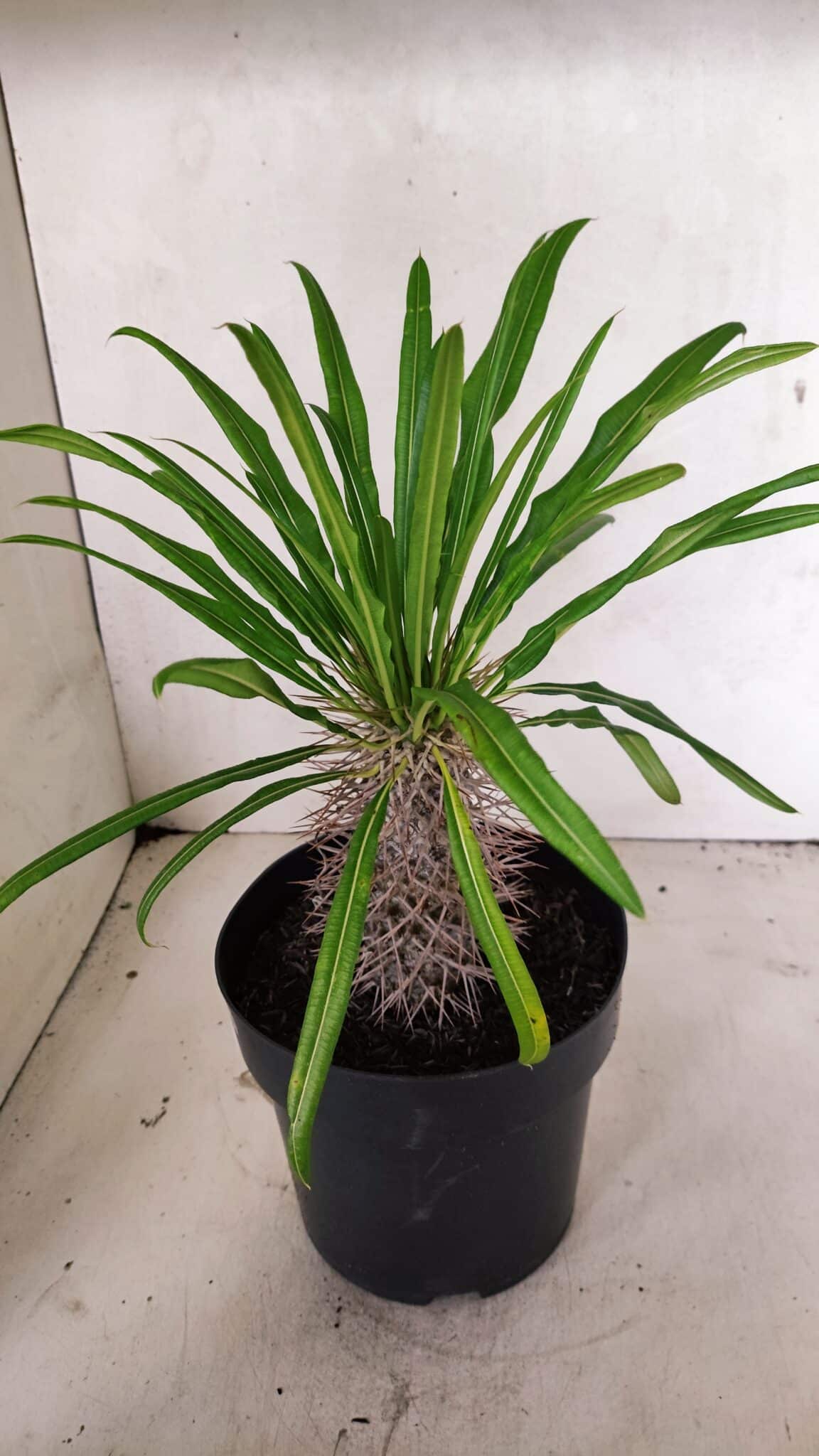 A Pachypodium Lamerei “palmeira de madagascar” é muito sensível ao encharcamento, que leva ao rápido apodrecimento da planta, então cuide para não regar em excesso. Re-envase anualmente para troca do substrato compactado.